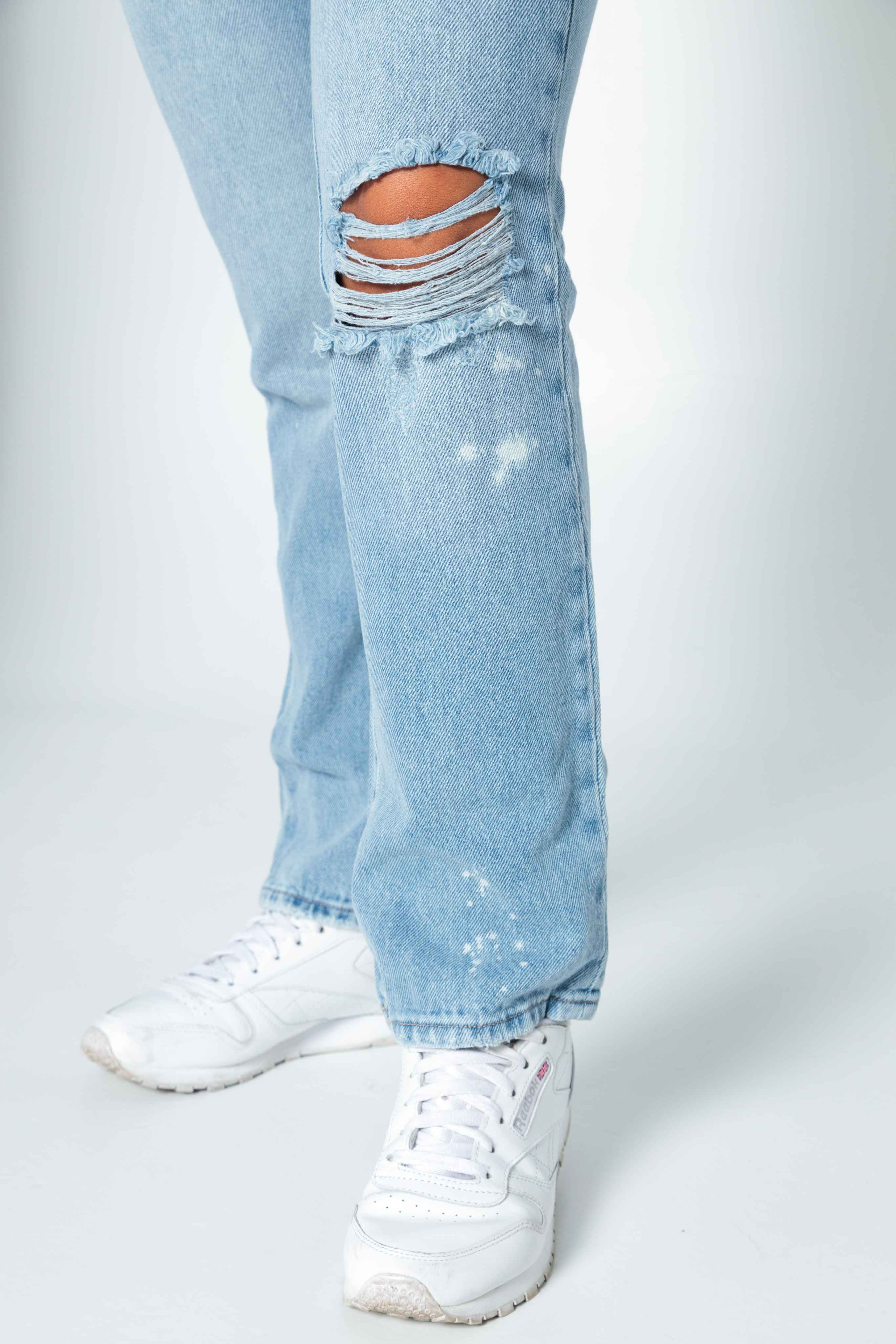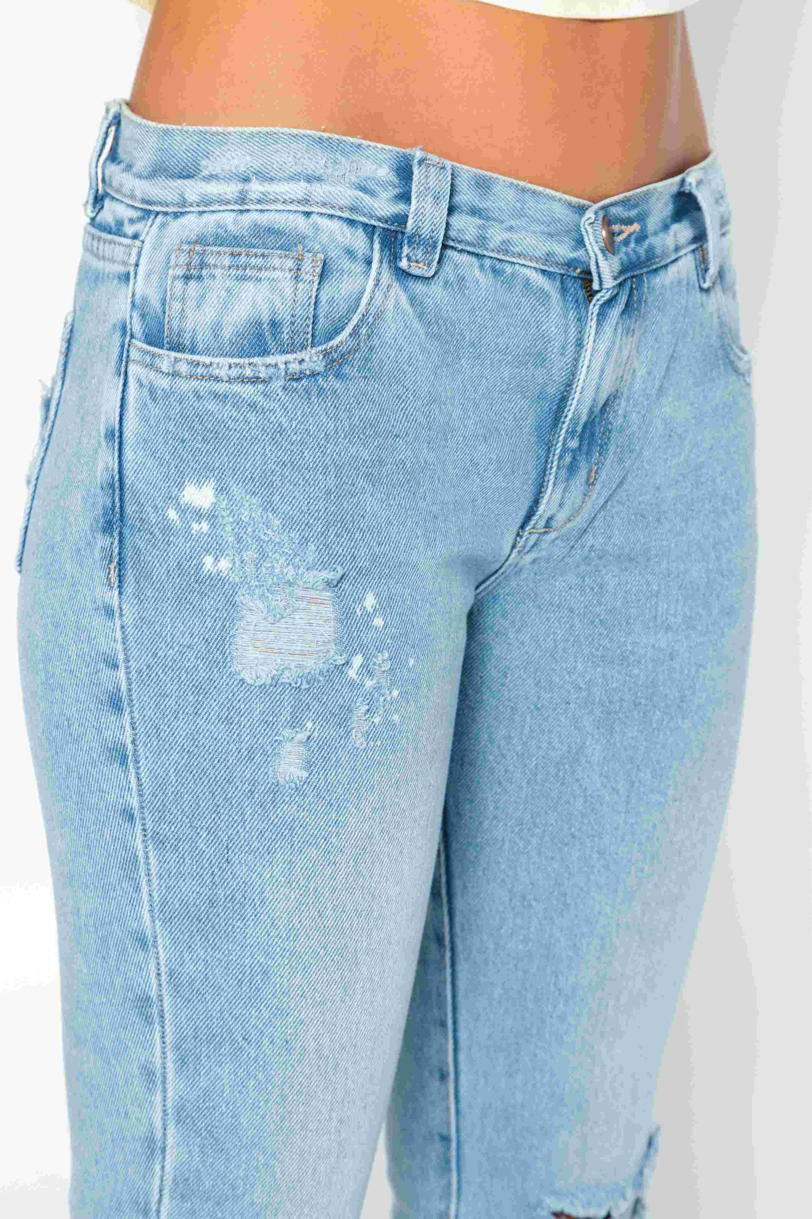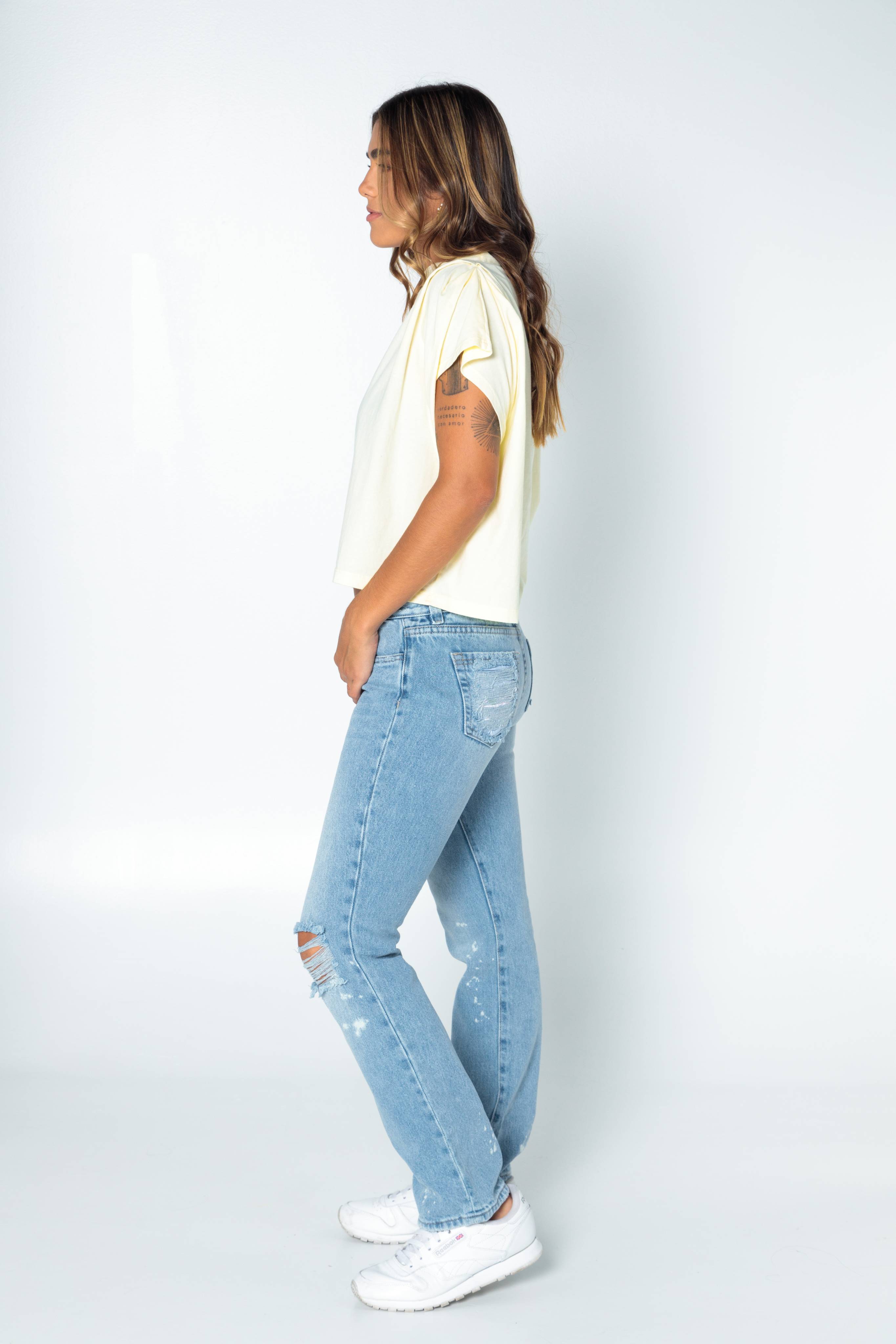 Jean descaderado ajustado de tiro bajo y bota recta, confeccionado con tela rígida para un look atemporal.