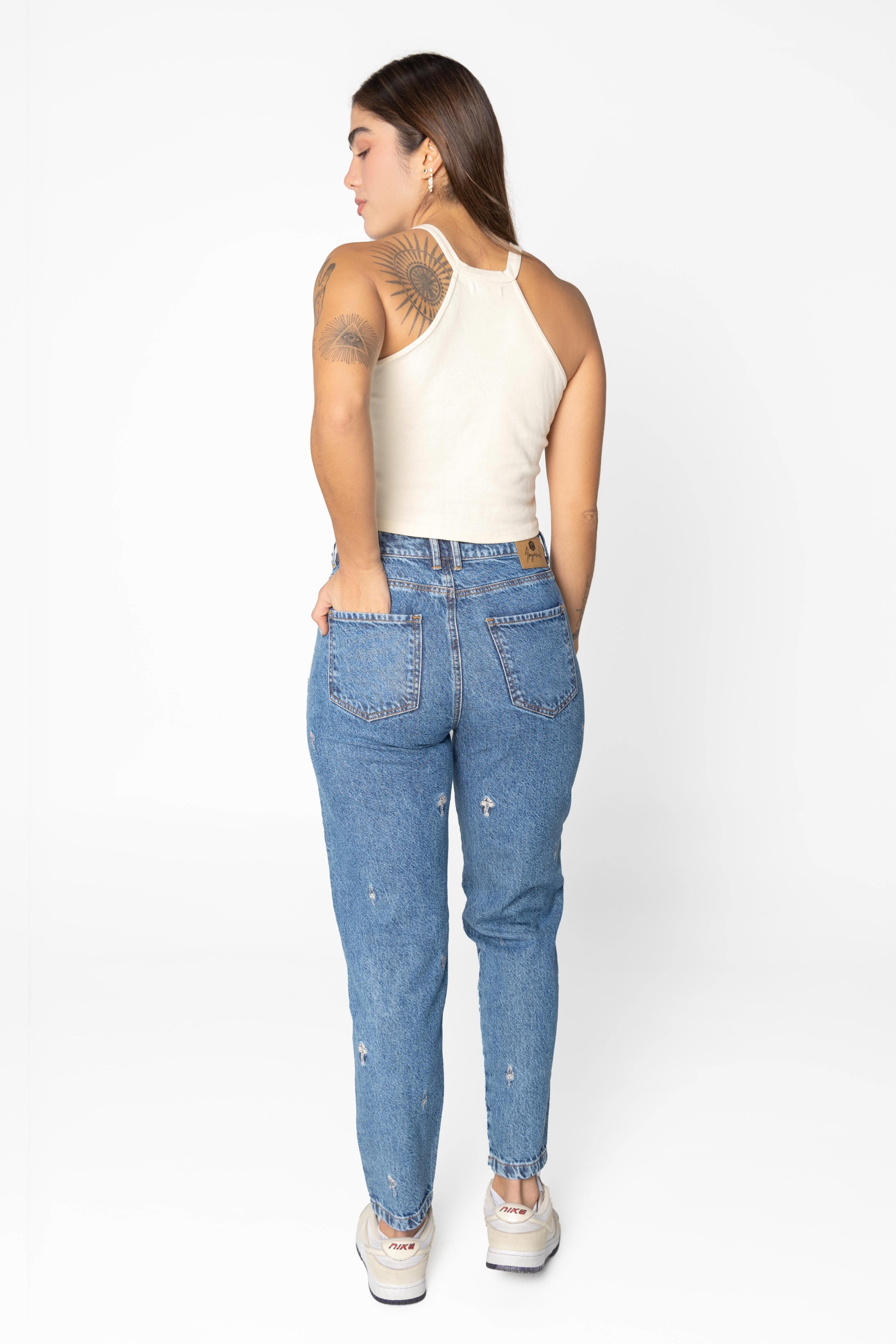 El jean vida busca resaltar con los bordados de diferentes tipos de hongos, la diversidad y la conexión con nuestra divinidad. Es un jean que nos inspira a vivir la vida intensamente, con diversión y sabiduría.