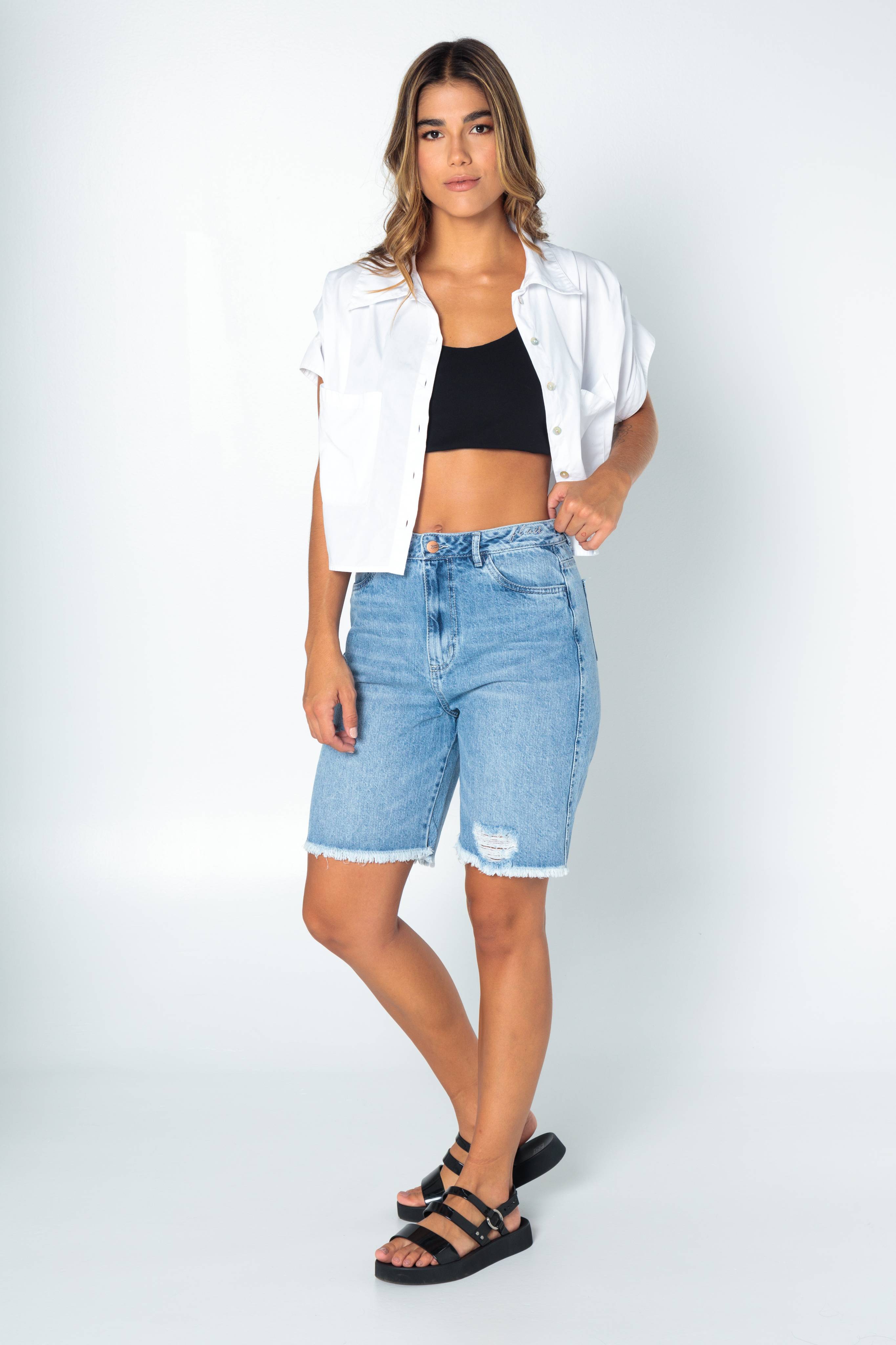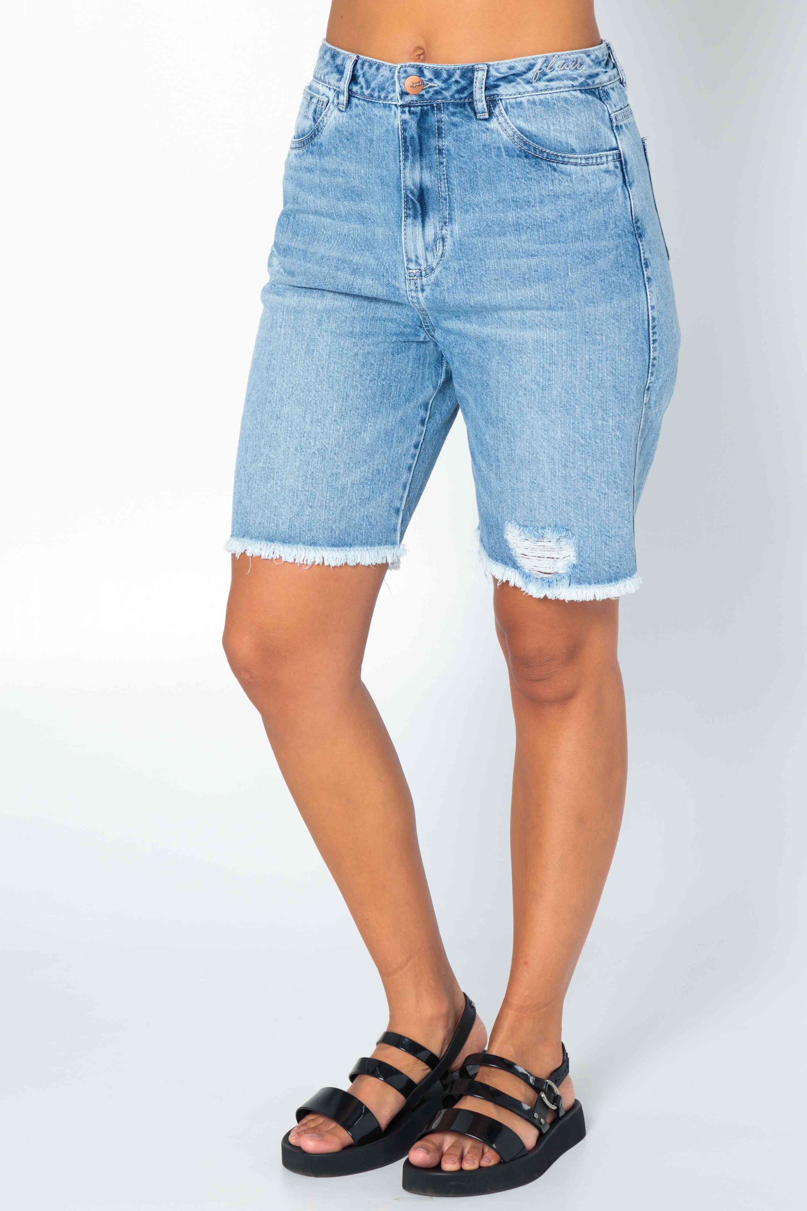 Descubre la libertad de movimiento con nuestro Short Fluir. Confeccionado en denim en tono azul claro y silueta mom fit, esta bermuda presenta tiro alto y una tela rígida para un ajuste cómodo. Cuenta con un corte desflecado en la rodilla, un roto delantero y una bordado en la pretina con el nombre Fluir. ¡Exprésate con confianza y estilo!